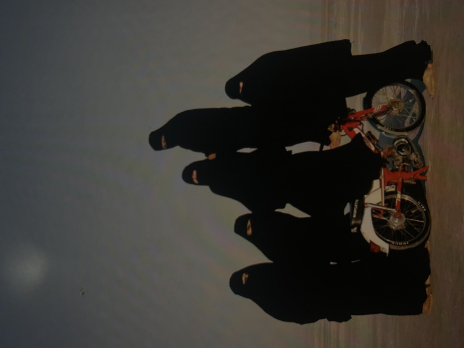 Five women in black niqabs stand in a line next to a bicycle. Their faces are barely visible through the slits in the fabric. The ground appears to be flat and desolate, while the sky is a pale blue. The bicycle is red and white and appears to be old. The overall image is stark and somewhat unsettling.