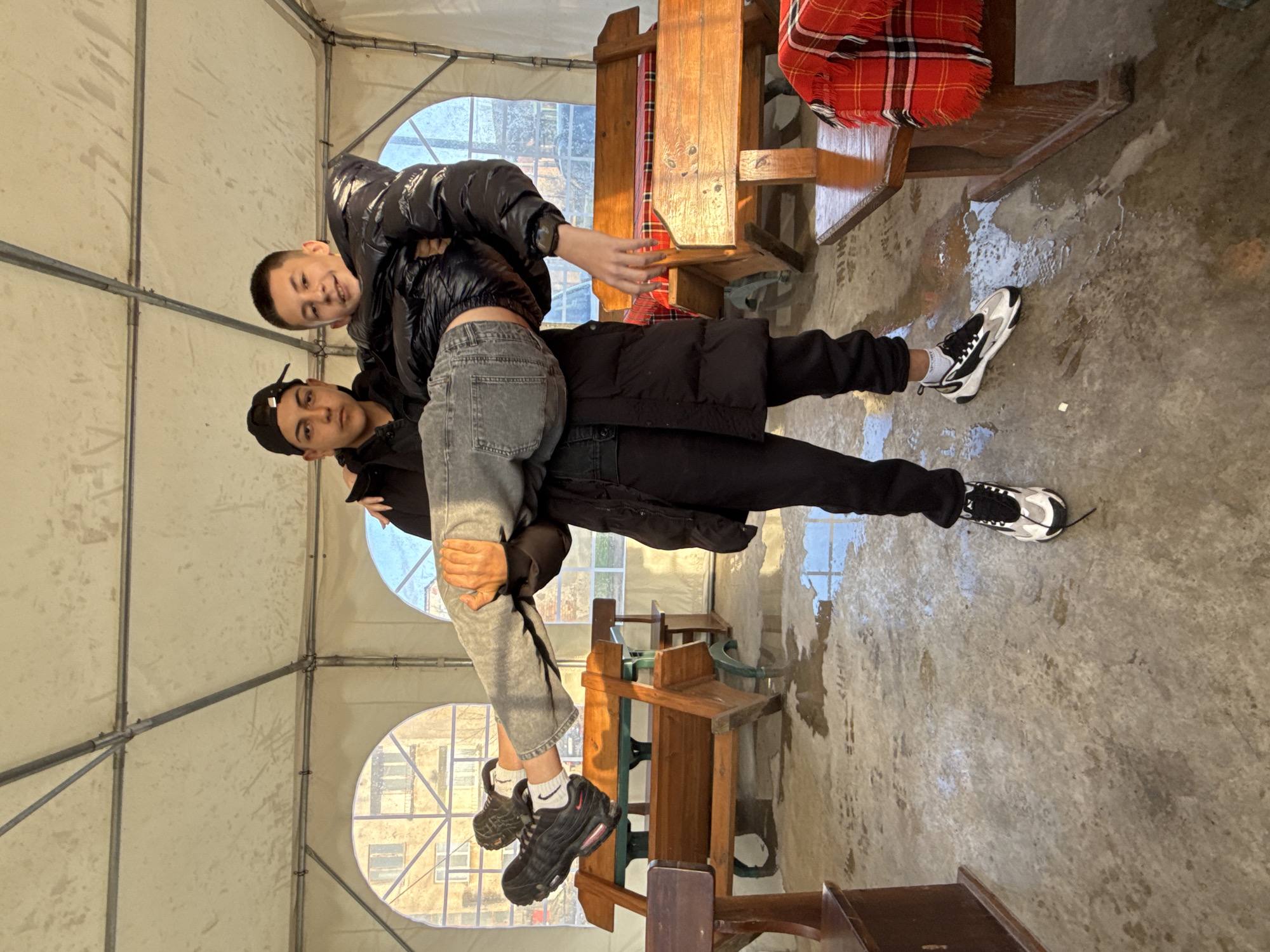 Two people are in a white tent with a wooden bench behind them. The floor is wet concrete. One person is carrying the other. They are wearing dark jackets and jeans. The location may be Zlatna Panega, Bulgaria, as specified. There are windows visible in the background.