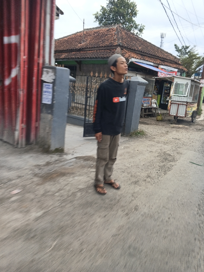 The image depicts a male individual standing on a paved surface in Rancamanyar, Indonesia. The individual, appearing to be an adult male, has short grey hair and wears a light-colored skullcap. He is dressed in a black long-sleeved shirt with a red and white YouTube logo on the chest and orange accents on the sleeves, khaki cargo pants, and brown open-toed sandals. His head is tilted upwards and to the right, with his mouth slightly open, indicating an upward gaze. The immediate foreground consists of a grey, uneven paved surface with areas of darker discoloration, suggesting dirt or moisture. To the left, a tall, vertical structure made of red corrugated metal is partially visible, appearing to be part of a gate or building facade. Adjacent to this and behind the standing individual is a grey concrete pillar, with several white papers affixed to its surface. A black wrought-iron gate is visible behind the individual, leading to a residence. In the mid-ground, a house with a reddish-brown tiled roof and green fascia is visible. To the right of the house, a small vendor kiosk with a blue awning displaying "MAS CAN...A" and various products is present. A green propane tank and a small wooden table are positioned near the kiosk. Further to the right, a second wheeled vendor cart with a glass display case is observed. Overhead utility wires traverse the upper right portion of the frame. The sky is overcast. A green tree crown is visible above the tiled roof of the house. The overall scene suggests a mixed-use residential and commercial street environment. Motion blur is present across parts of the image, particularly on the ground and the left side.
