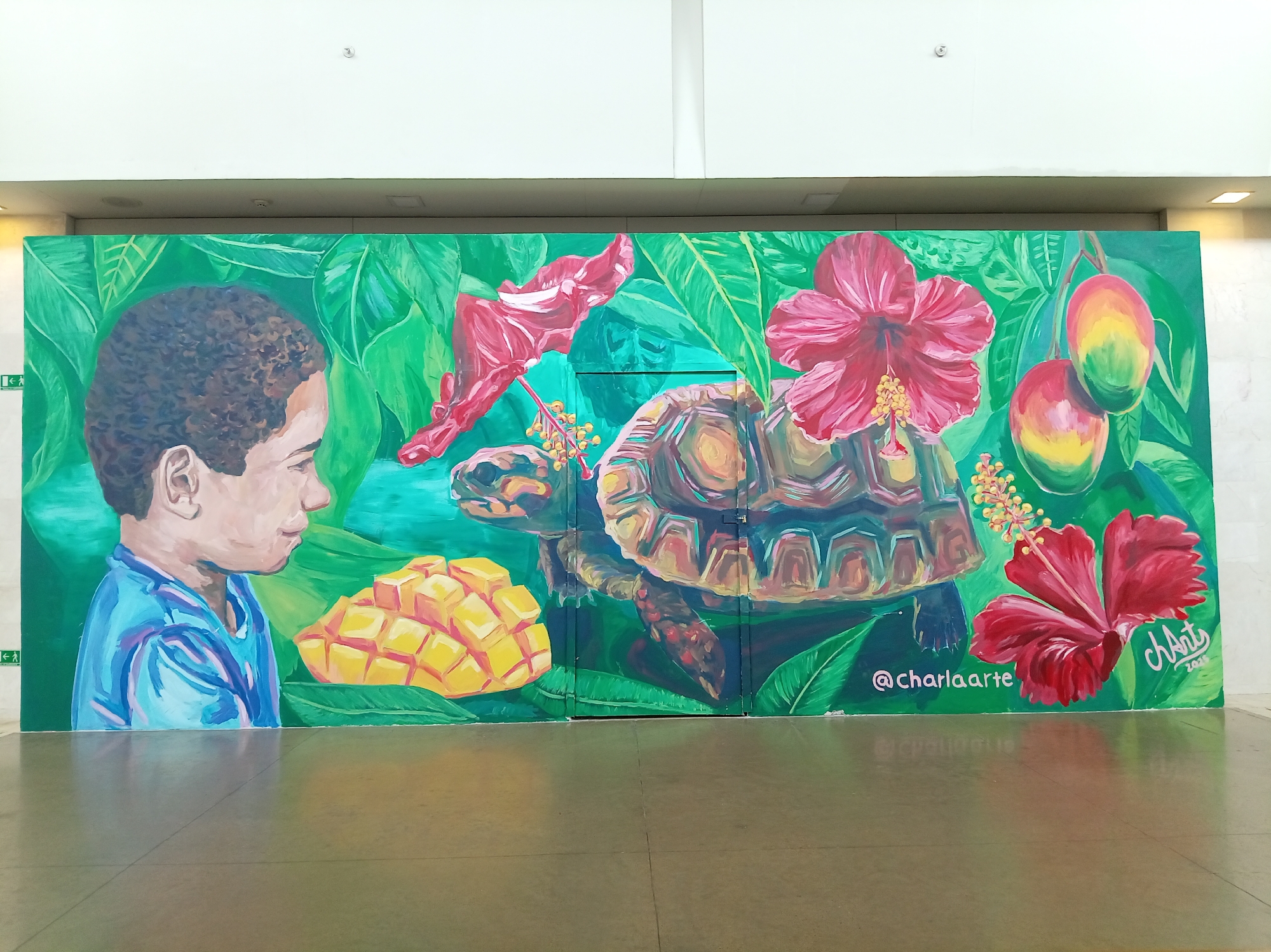 mural on a green wall, possibly in an indoor location. On the left of the mural is the profile of a young boy with curly dark hair, wearing a blue shirt. Next to him, a sliced mango rests on a green leaf. Moving right, there's a turtle with a brown and orange shell, surrounded by tropical foliage. Red hibiscus flowers are scattered throughout the scene. Hanging from the upper right are two mangoes that are yellow and red. At the bottom of the mural, the text "@charlaarte" and "chArts 2023" are written in white. The floor reflects the mural in a blurred manner. The location in the city of Unknown, Unknown is not known based on the visual content.