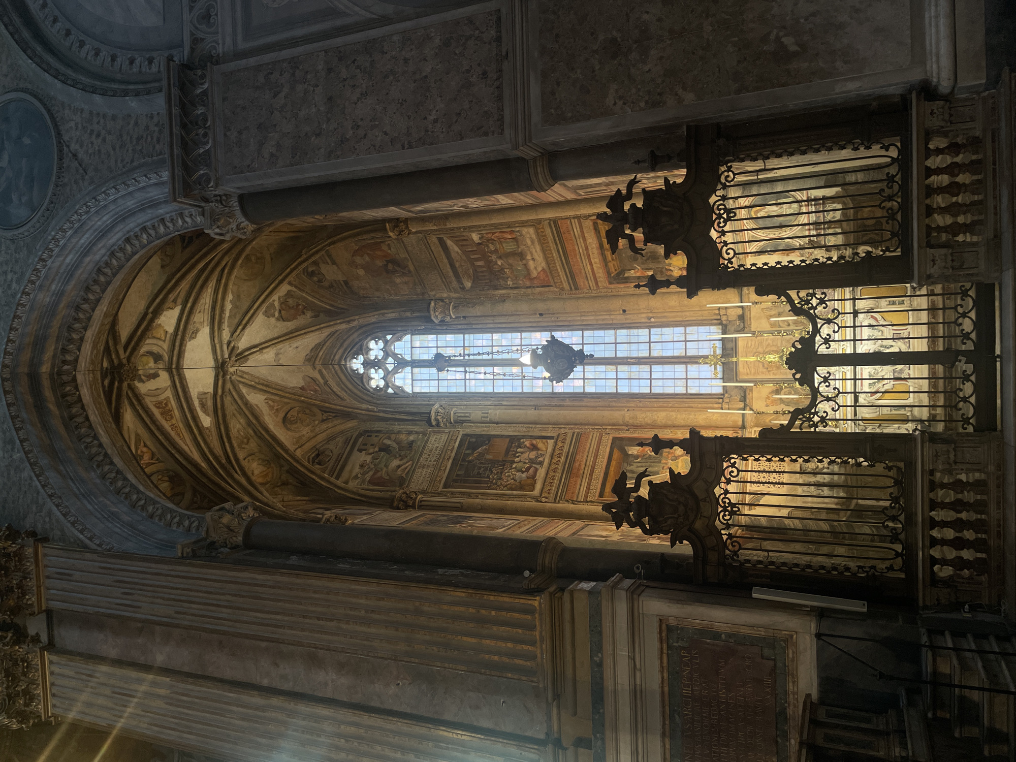 The image captures the interior of a historical building, likely a church or cathedral, characterized by its elaborate Gothic architectural elements. A high, arched ceiling adorned with frescoes and decorative moldings is visible. Light streams in through a large, multi-paned window, illuminating a portion of the interior. An ornate metal gate or screen is positioned in the foreground, possibly separating different sections of the space. Architectural details include columns, carved elements, and decorative lighting fixtures. Text on a plaque or inscription is also visible. The building is located in Naples, Italy.