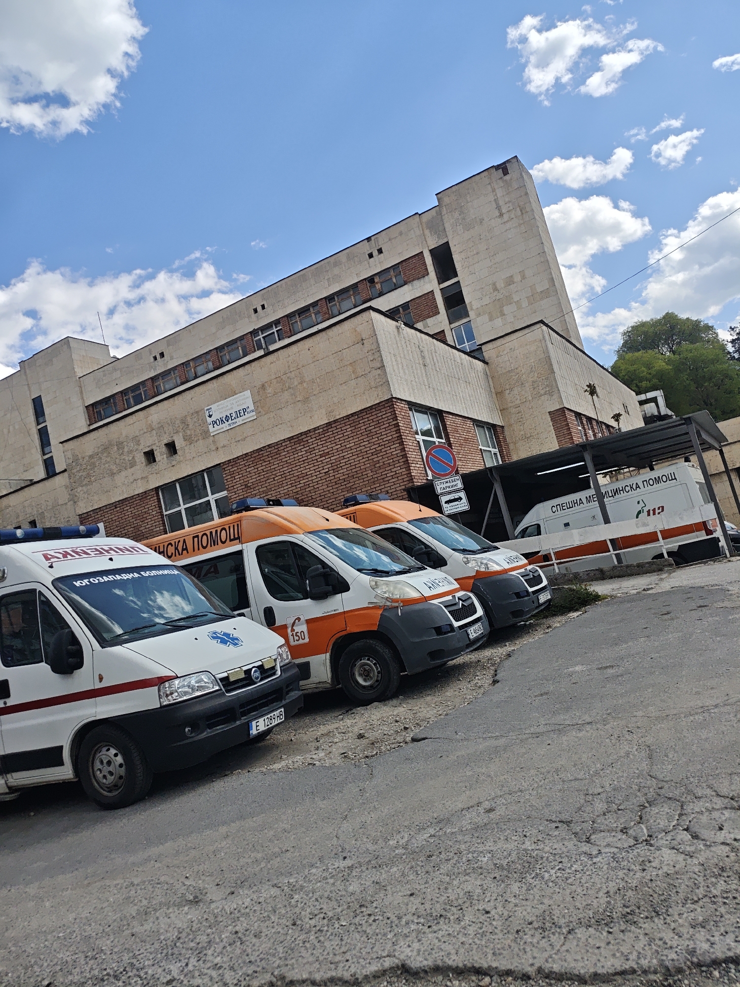 The image depicts a row of ambulances parked in front of a building in the city of Unknown, Unknown. The building appears to be a hospital, with a sign that says "РОКФЕЛЕР" and "ЮГОЗАПАДНА БОЛНИЦА". The ambulances are parked on an asphalt road, and there is a sign that says "СЛУЖЕБЕН ПАРКИНГ" (Service Parking). The sky is blue with some clouds. The ambulances have the inscriptions "АХЕИЛИЯ МЕДИЦИНСКА ПОМОЩ" (Emergency Medical Assistance) and "СПЕШНА МЕРИЦИНСКА ПОМОЩ" (Urgent Medical Assistance). One of the ambulances has the number "150" and another "112". A license plate is visible on one of the ambulances: "E 1289 HB".