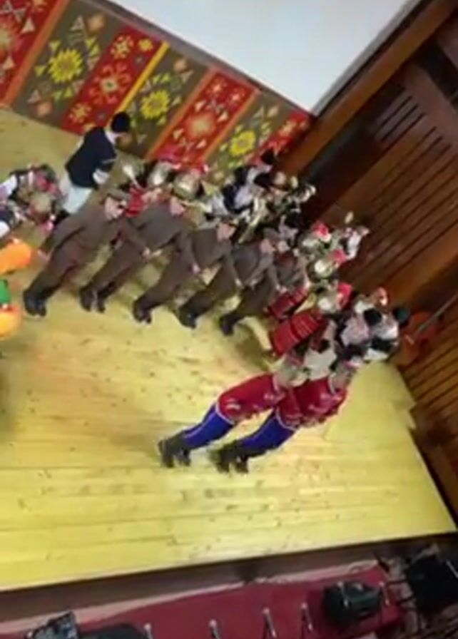 On a wooden stage lit with yellow light, a group of dancers is performing. The camera's vantage point is from above, slightly angled. The dancers are clad in traditional costumes; some wear brown military-style uniforms, while others don vibrant outfits with red, white, and black elements. Some are in red and blue. The dancers are positioned in multiple lines, creating a formation as they move. Behind the dancers, a colorful tapestry hangs on the wall. Musical instruments and microphones are arranged on the floor in the foreground, suggesting a live performance setup. Above the stage, a projection screen displays an indiscernible image.