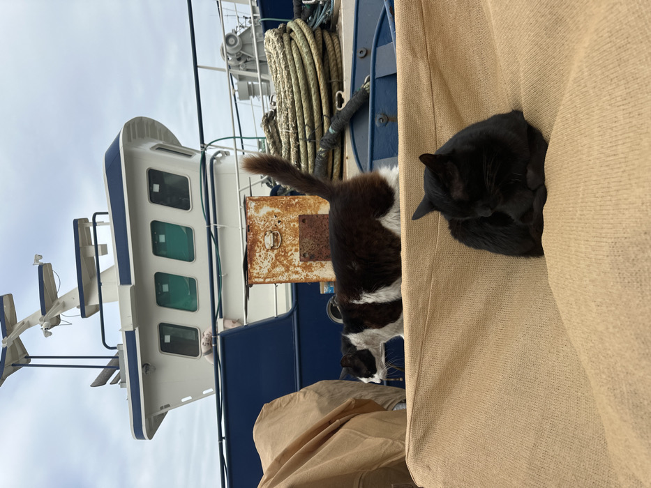 A boat features a blue and white exterior with a navigation tower. Several ropes are coiled nearby. Two cats are visible. One cat is black, curled up, and appears to be sleeping on a tan surface. The other cat is black and white, with its tail upright, looking downward. The scene suggests a moment of tranquility onboard.
