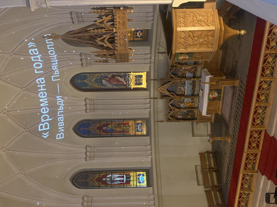 The image displays the interior of the Evangelical Lutheran Cathedral of Saints Peter and Paul, located in Starosadsky Lane, Moscow, Russia. The perspective is from an elevated position, looking down into the chancel and nave. The scene features a Gothic-revival architectural style with high, vaulted ceilings and pointed arches. Three tall, arched stained-glass windows are visible on the far wall, depicting religious figures including what appears to be Jesus Christ in the rightmost window, flanked by two other figures (a cleric and another saint/apostle). At the center of the chancel, a wooden altar is covered with a white cloth, holding an open book and two candlesticks. Behind the altar stands an elaborately carved wooden reredos, featuring a detailed relief sculpture depicting the Last Supper scene, framed by gothic architectural elements. To the left of the altar, two simple wooden benches are positioned against the wall, with a small, ornate pedestal-like object in front of the altar to their right. On the right side of the chancel, a large, intricately carved wooden pulpit is affixed to a pillar, featuring detailed floral and foliate patterns. Two microphones are mounted on its upper edge. The floor of the chancel area includes a checkered pattern partially covered by a red carpet runner that extends up to the altar steps. A bright white projection is visible on the upper left portion of the vaulted ceiling, displaying Cyrillic text. The text reads: «Времена года» (The Seasons) followed by Вивальди — Пьяццолла (Vivaldi — Piazzolla), indicating a cultural or musical performance. The foreground shows a section of a red-carpeted walkway and a carved wooden railing, consistent with a gallery or upper-level seating area. No individuals are present in the frame. The lighting suggests an indoor environment, possibly supplemented by artificial light, with visible dust motes in the air illuminated by the projected light.