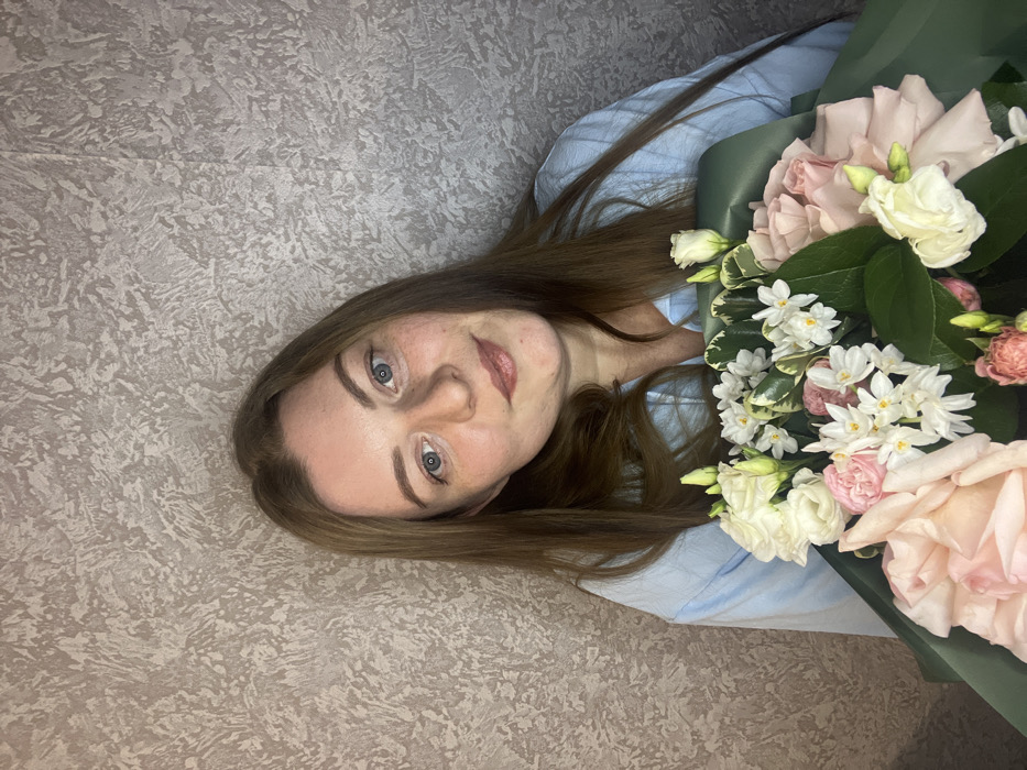 The image displays a Caucasian female subject indoors. While the provided context specifies Раздолье, Russia, the visual evidence within the image does not confirm this specific geographical location. The female, appearing to be in her 20s or 30s, has long, light brown hair and blue eyes, and is looking directly at the camera with a slight smile. She is wearing a light blue collared shirt. She holds a large bouquet of flowers wrapped in dark green paper, positioned in the lower central portion of the frame. The bouquet contains several pale pink roses, white and cream-colored eustoma flowers, and small white clustered blooms with dark green foliage. The background consists of a textured, light beige or off-white wall, suggestive of an interior residential or commercial space.