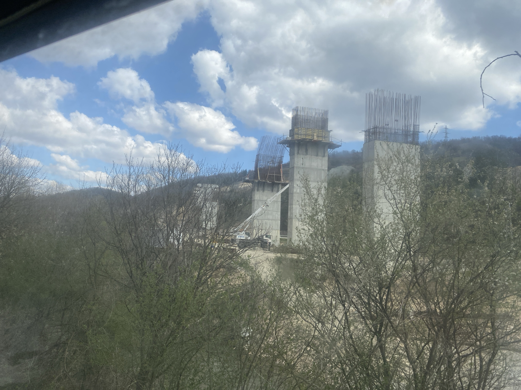 The image depicts the construction of bridge supports in a rural area. The supports are tall, reinforced concrete pillars topped with rebar and formwork. Construction vehicles and machinery are visible near the base of the supports. The background includes hills and vegetation, with a partly cloudy sky overhead. The location is identified as near Gabrovitsa, Bulgaria. The trees in the foreground are mostly bare, with some beginning to bud.