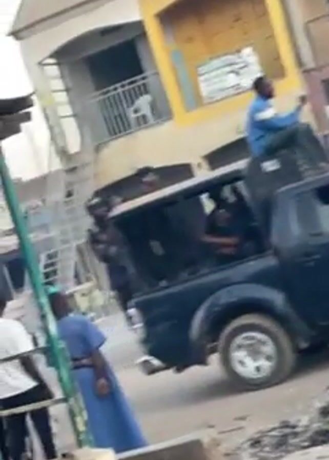 street scene in what appears to be a town or city in Nigeria. A black police pickup truck is visible, with a man in a blue shirt sitting on the cab roof, holding a phone. The truck has the words "POLICE" on its side and red and blue lights on the roof. The truck is labeled, "Kaduna State Vigilance Service" and "Sama San Local Government." Other people are standing and walking around the street, some wearing traditional clothing. Some litter is on the street. There are shops and buildings in the background. At one point in the video a black SUV drives in front of the pickup truck. An alarm, likely a siren, sounds throughout the video.