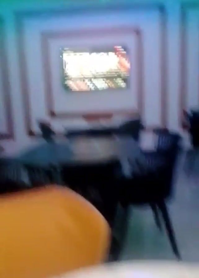 The camera pans up to reveal a room, possibly a cafe or restaurant, with a modern interior design