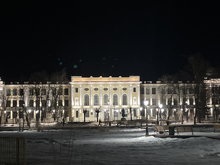 - "The image depicts a grand, multi-story building at night in the city of Kozlovo, Russia, viewed across a snow-covered park or square" by FM-rZtew2, licensed under CC BY 4.0