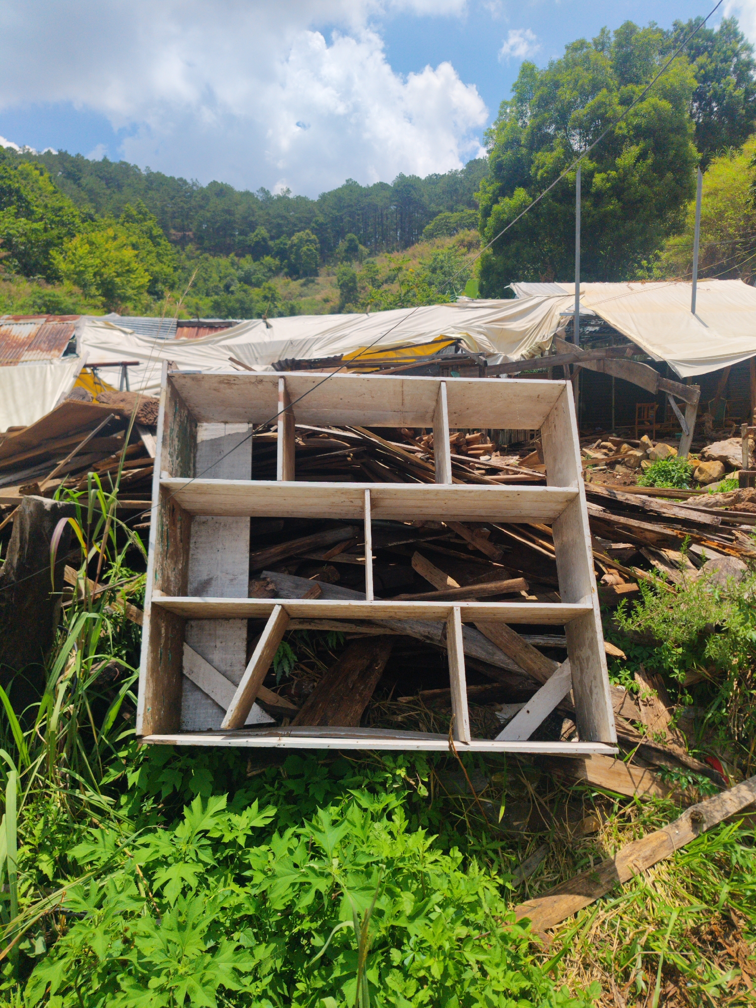 dilapidated wooden shelving unit sitting amidst overgrown vegetation and scattered wooden debris in what appears to be an outdoor area