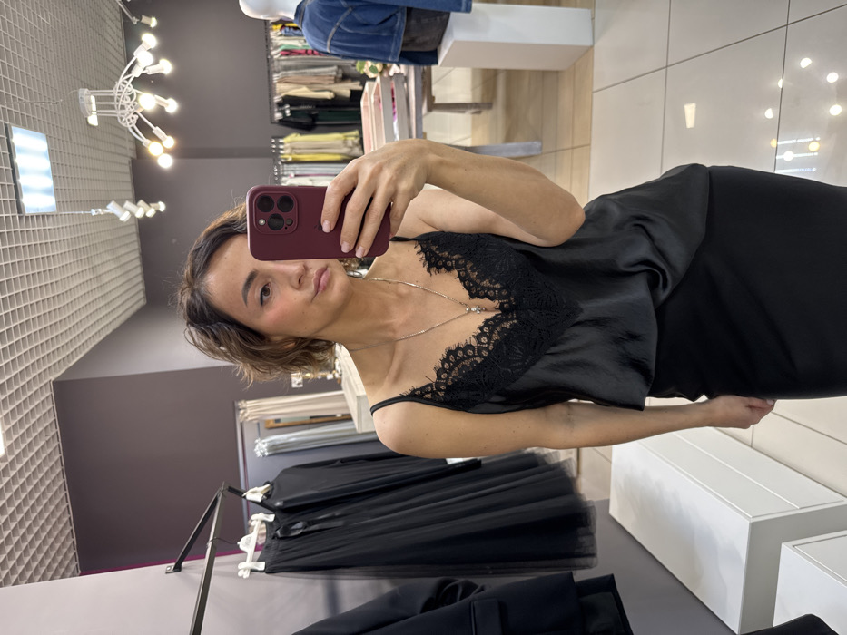 A woman in a black satin top with lace trim and a black skirt takes a selfie in a store