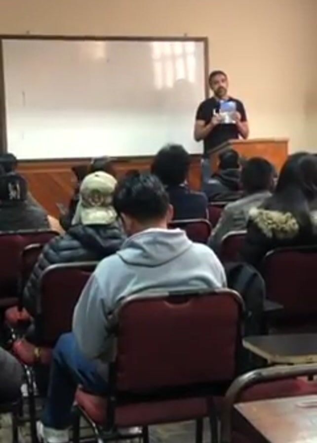 A man stands on a small, raised platform in a classroom, addressing a group of students seated in rows of maroon chairs. He is holding a small, rectangular object, possibly a book, in his hands. He is wearing a black t-shirt and jeans. The students are facing him, though most are looking down. Some students are wearing jackets or hats. Behind the man is a whiteboard and a wooden panel on the lower half of the wall. The classroom appears to be modestly furnished.