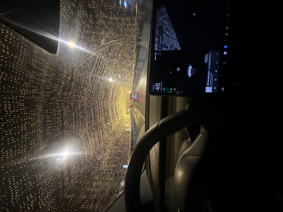 The photo displays a night view from inside a car, focused on the brightly lit road ahead