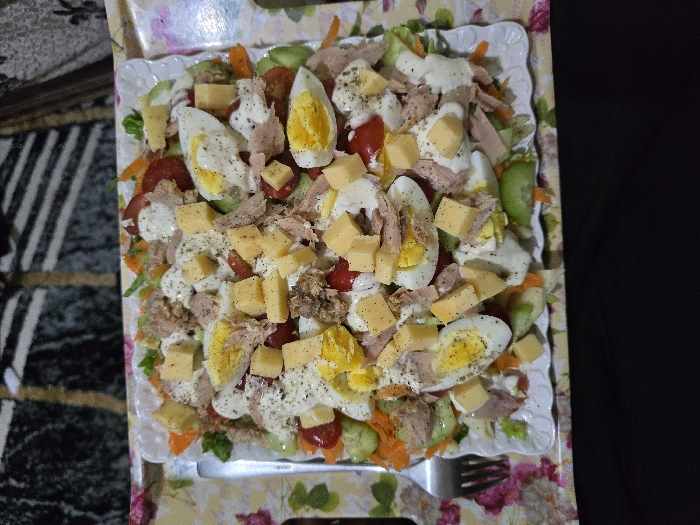 A square white plate holds a tuna salad. Halved hard-boiled eggs, cheese cubes, chopped tomatoes, and cucumber slices are mixed with tuna and a creamy sauce. Shredded carrots add a touch of orange. Black pepper is sprinkled on top. The plate sits on a floral-patterned tray, and a fork rests on the lower left corner.