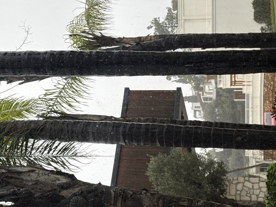 A rain-blurred view through the trunks and fronds of palm trees reveals a building with a pointed, shingled roof and a glimpse of white townhouses beyond