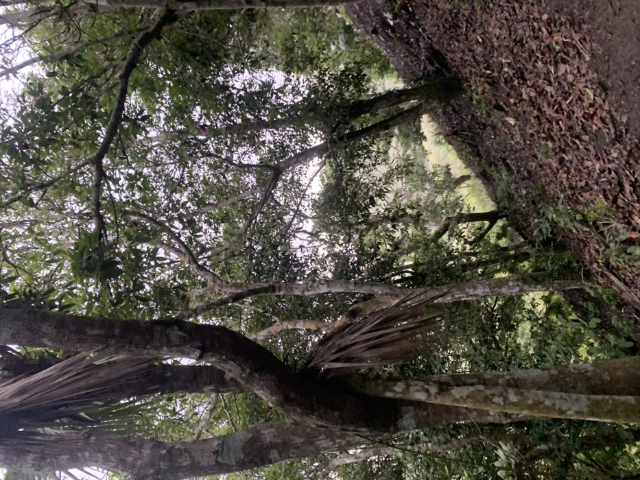 The image depicts a dense forest canopy, viewed from a low angle. Thick tree trunks rise upwards, supporting a complex network of branches and leaves. Light filters through the canopy, creating dappled shadows on the foliage. A pathway covered in brown leaves is visible on the right edge of the picture. The view is somewhat obscured by the closeness of the trees.