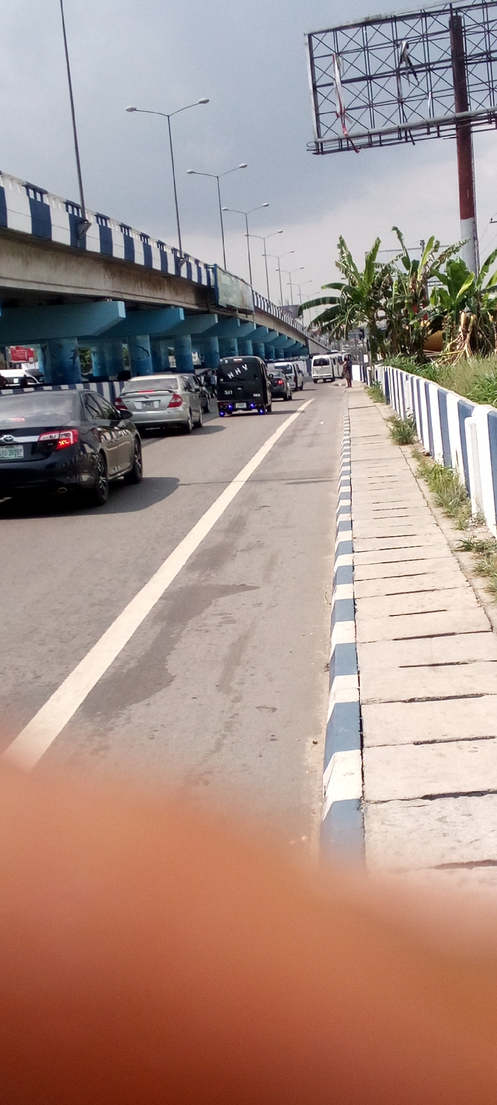 view of a road under a bridge in Port Harcourt, Nigeria. The road is paved with asphalt and has a white line down the middle. There are several cars parked on the side of the road, and a few more cars are driving on the road. The bridge is made of concrete and has blue and white stripes painted on it. The sky is overcast with white clouds and the sun is shining brightly. The bridge is supported by large pillars. There are trees and shrubs on the side of the road. A person is walking along the sidewalk on the right side of the road. The image was taken from the perspective of someone on the sidewalk, looking down at the road. The image is taken on the Aba road close to the Garrison junction in Port Harcourt, Nigeria. The latitude and longitude coordinates provided are 4.825 and 7.006. The image was taken during the daytime.
