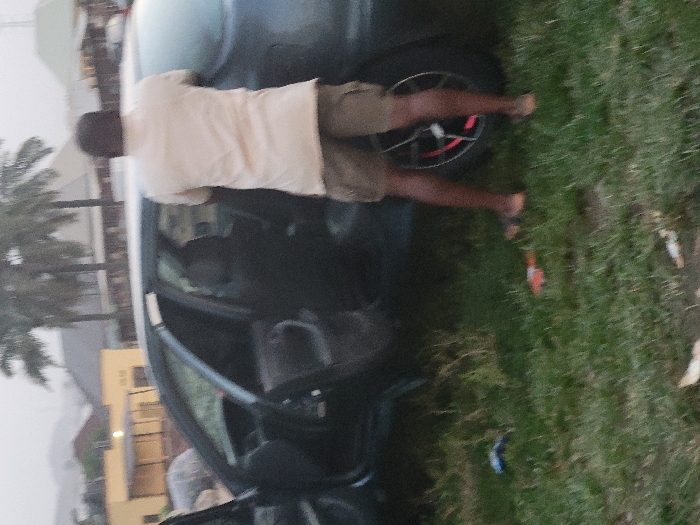 A man in a light-colored shirt and khaki shorts leans into the open driver's side of a dark-colored car. The vehicle is parked on a grassy area. A tire is visible next to the grass. In the background are buildings and a palm tree against a cloudy sky. The photograph is rotated to the side.