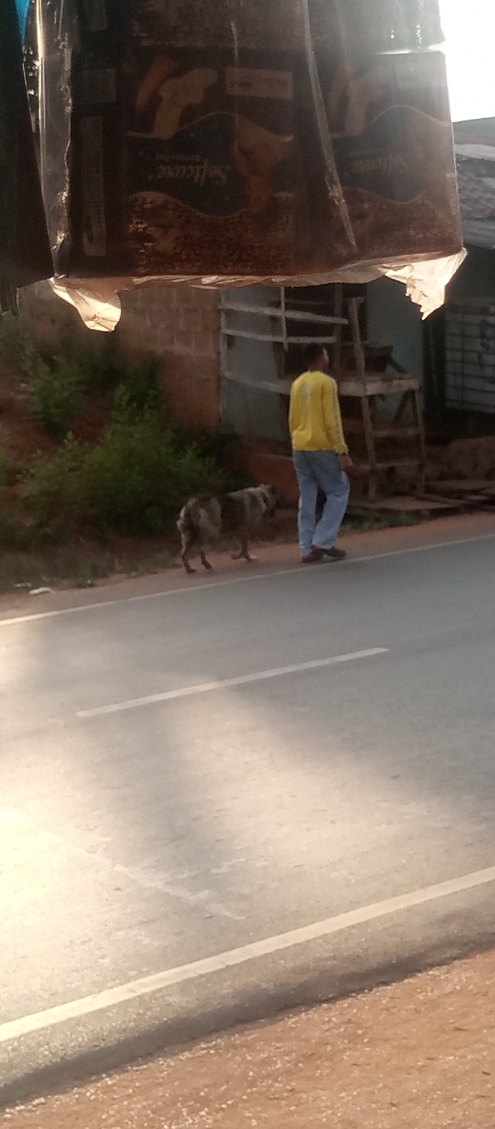 - "A man in a yellow shirt and blue jeans walks alongside a large, gray dog on the side of a paved road" by FM-qZjH53, licensed under CC BY 4.0