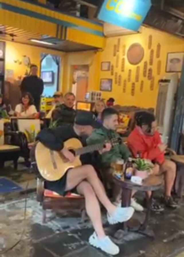 Here is a detailed description of the video: The video shows a musician playing guitar in what appears to be a restaurant or cafe setting. The musician, who is wearing a black cap, black top, and black shorts, is sitting on a wooden chair with a cushion, strumming an acoustic guitar. He also has on white shoes. In front of him, at a small wooden table, sit three people. Two men appear to be enjoying the music, and one woman is preoccupied with her phone. There are beer bottles on the table. Other patrons are seated at tables in the background, and some appear to be listening to the musician. The interior design features yellow walls decorated with various pictures and artwork. Overhead, there's a blue sign with white lettering written in a language other than English, and hanging colorful lanterns. The flooring has a wet look. The lighting suggests it is evening or nighttime.