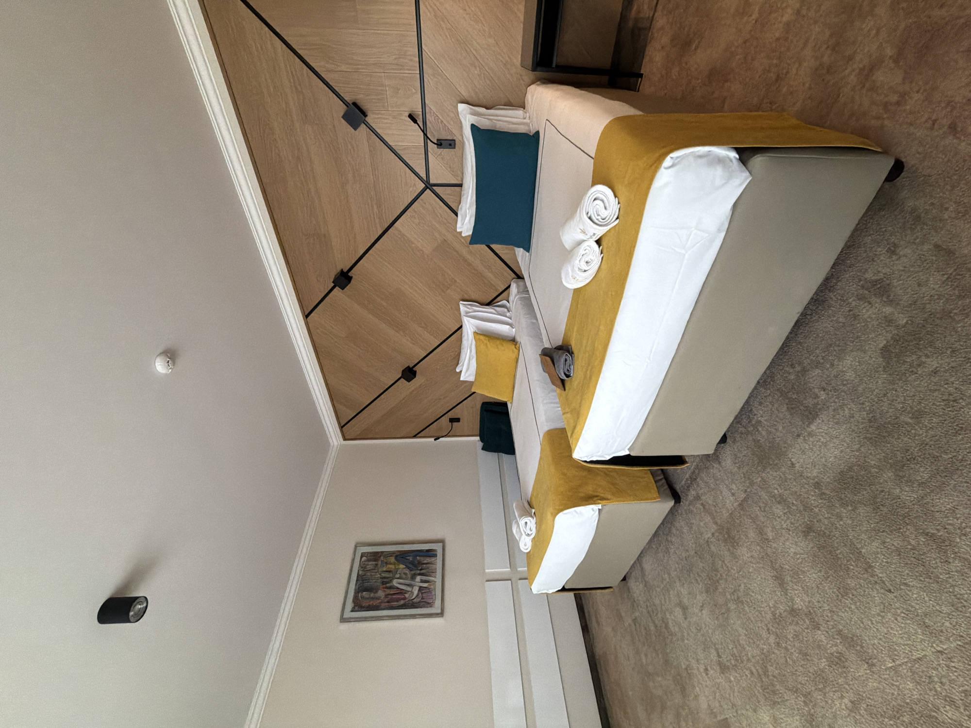 An interior shot of a hotel room, possibly located in Pavel Banya, Bulgaria, based on the presence of what appears to be a hotel room layout. The room features two single beds with white linens, mustard-colored throws, rolled-up white towels, and decorative pillows in shades of blue and yellow. The beds have a light beige or grey upholstered frame. The floor is covered in light brown carpet. The walls are painted in a neutral beige color, and one wall features a framed painting. The ceiling is partly plain beige, partly covered with light wood panels arranged diagonally, intersected by a grid of black metal fixtures, possibly for lighting or decoration. A black cylindrical light fixture is mounted on the wall. The overall impression is of a modern, well-maintained hotel room.