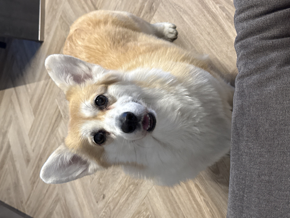 The image depicts a domestic canine, specifically a Welsh Corgi, positioned indoors