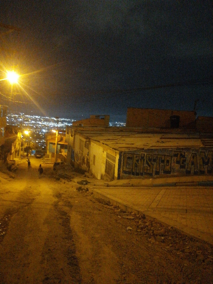 A dimly lit, downward sloping dirt road at night. A bright streetlamp casts a yellow glow on the scene, illuminating figures in the distance. Houses flank the road on either side, some with graffiti reading "CRISTO TEAM." In the background, a city lights up the horizon under a dark sky. The scene evokes a sense of urban poverty and quiet isolation.