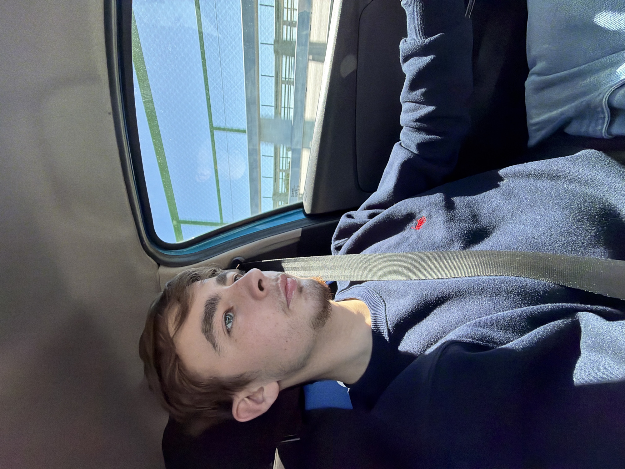 The image depicts a young male seated in the passenger compartment of a vehicle. The subject has light brown hair, blue-green eyes, and light facial stubble, observed looking towards the right of the frame. He wears a dark blue crew-neck sweatshirt with a small red embroidered logo on the left chest. A light-colored seatbelt diagonally crosses his chest from his left shoulder. The vehicle interior includes a light gray headliner, a teal-colored window frame, and a dark door panel. Sunlight illuminates the subject and interior from the right. Outside the vehicle's window, under a clear blue sky, an elevated concrete bridge structure is visible. This structure features multiple horizontal grey beams and a green metal safety railing or mesh fence. The scene takes place in the city of Macedo de Cavaleiros, Portugal, from a perspective implying travel near or adjacent to the aforementioned bridge.