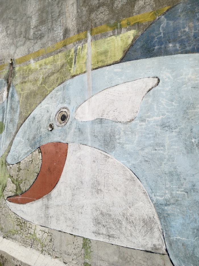 The image depicts a weathered concrete wall in Voa Yeav, Cambodia, featuring a large, partially visible mural. The central subject of the mural is a stylized, light blue marine creature, possibly a fish or dolphin, presented in profile facing left. It possesses a circular eye with a black pupil and a brown iris, and two smaller dark circular protrusions directly below the eye. A prominent, curved section in reddish-brown defines the creature's mouth, bordered by a large, curving white segment below it. Another white, roughly triangular element suggestive of a fin is located on the creature's upper body. The mural's background includes faded green, yellow, and dark blue sections, with a horizontal yellow stripe present across the upper portion of the wall. The entire painted surface and surrounding concrete exhibit extensive cracking, discoloration, and patches of greenish biological growth. Vertical streaks are evident, indicating past water runoff. No individuals or specific actions are depicted in the scene.