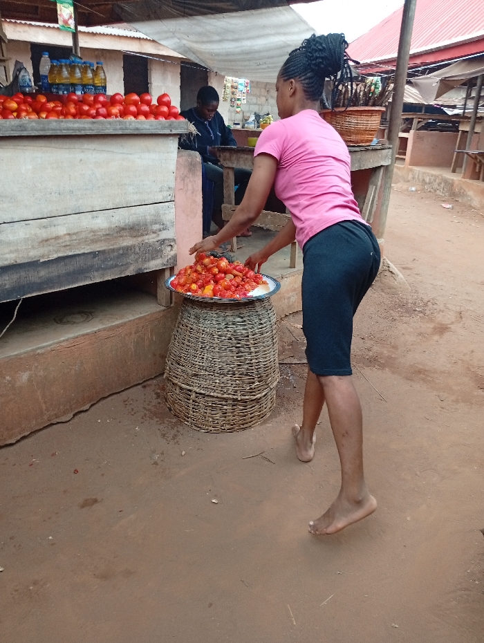 The image depicts an outdoor market stall in Omicha Umu Awada, Nigeria
