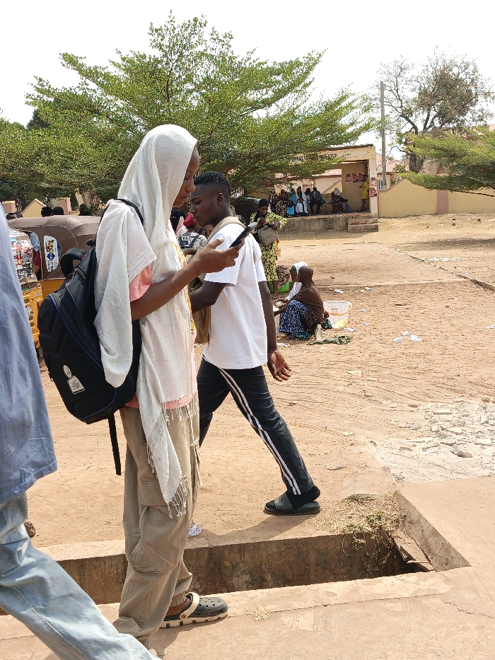 An outdoor scene in Lafia, Nigeria, depicts a daytime public area with reddish-brown unpaved ground. In the left foreground, a person, positioned in left profile, wears a white head covering, a light-colored top, beige cargo pants, and black and beige clogs. They are holding and viewing a white smartphone. A black backpack with a white tag is worn on their back. Partially visible to the extreme left is a person's leg in light blue trousers. In the midground, a young man walks from left to right, looking down at a dark smartphone held in his right hand. He wears a white t-shirt, dark athletic trousers with two white side stripes, and black sandals. A dark bag is visible on his shoulder. An open concrete drainage channel or culvert runs horizontally across the lower midground. Further right, an individual in a brown head covering and patterned blue dress sits on the ground next to a white plastic bucket containing yellow contents. A brown and yellow three-wheeled auto-rickshaw is partially visible on the far left. The background features a single-story building with a light brown facade and a lighter roof overhang. A group of people is congregated on a raised platform outside this building, with one person in yellow standing near the entrance. Another group gathers under a large green-leafed tree to the far left. The sky is clear.