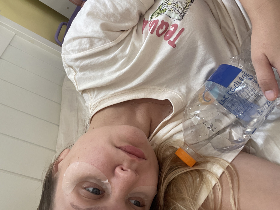 The image depicts a female individual, appearing to be a young adult, lying on her side in an indoor setting. She has fair skin, light-colored hair, and is looking directly at the camera with a neutral expression. Two transparent, gel-like under-eye patches are applied beneath her eyes. She is wearing a light-colored, short-sleeved t-shirt with a graphic design on the chest, which includes pink text, possibly "TEQUILA," and an illustration of a cocktail. A thin necklace is visible around her neck. She is holding a clear plastic water bottle with an orange cap in her left hand, resting against her chest and shoulder. The bottle exhibits condensation and contains some liquid. A blue and white label with Hebrew text, reading "מי עדן" (Mei Eden), is visible on the bottle, indicating an Israeli product. The immediate environment consists of white bedding and a white headboard or wall paneling directly behind her. In the upper right background, a portion of a yellow wall and a purple object, possibly a handle or part of furniture, are discernible, suggesting a domestic interior. The Hebrew text on the water bottle indicates the scene is located in Israel; however, no specific visual cues within the image permit a definitive identification of its location within the city of Tel Aviv.