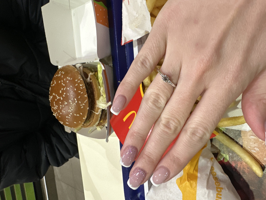 The image depicts an indoor scene within a McDonald's restaurant in Sofia, Bulgaria. In the immediate foreground, a light-skinned right hand with a French manicure (clear/pink base with white tips, and glitter on the ring finger nail) is prominently displayed. A silver-toned ring featuring a central dark-colored stone flanked by two smaller clear stones is worn on the ring finger. The hand is positioned over a blue plastic fast-food tray holding a meal. The meal consists of a large hamburger, identifiable by its sesame seed bun and layered contents (patties, cheese, lettuce), presented in an open white cardboard box with green and orange accents. Adjacent to the hamburger are golden-brown french fries, partially contained within a red and yellow McDonald's-branded paper bag, and some spilling onto yellow wrapping paper. An additional, empty white cardboard container is visible to the right of the hamburger. In the upper left background, the torso and left arm of a second individual are partially visible, clad in a dark, possibly black, puffy winter jacket. The immediate environment includes a light-colored table surface. The scene is illuminated by artificial indoor lighting. No active interaction with the food is depicted, the focus being on the hand, ring, and meal.