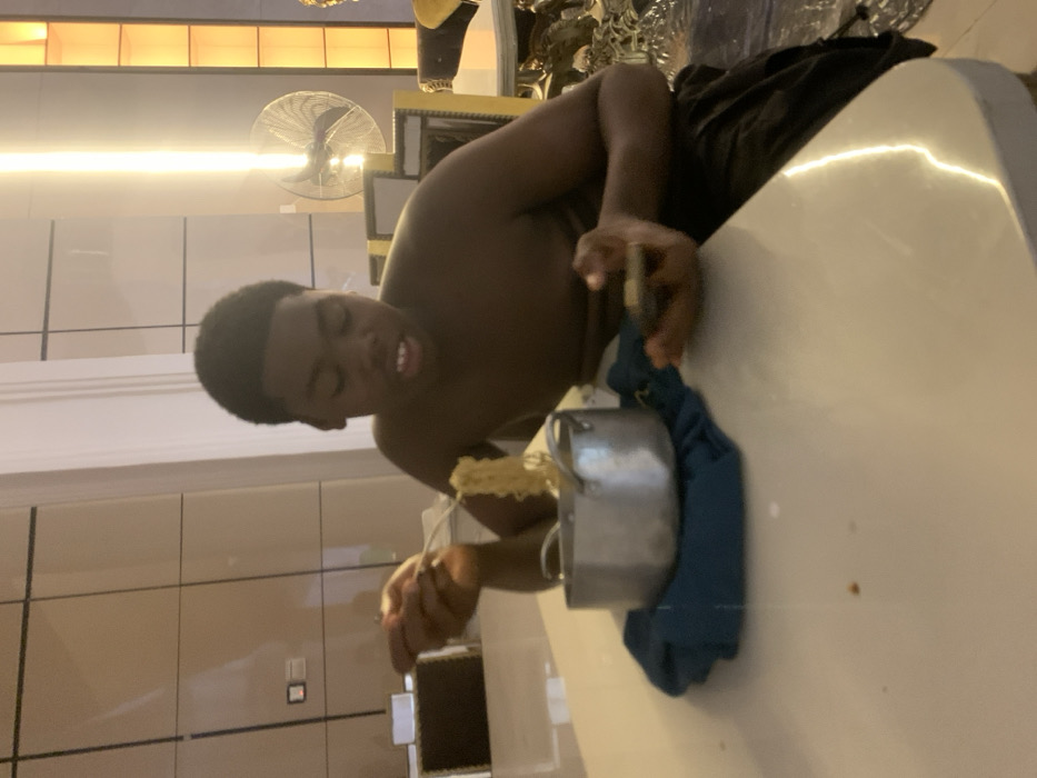 A shirtless young man is eating noodles from a metal pot. He is holding a fork with noodles on it in his left hand, and his right hand appears to be holding a phone. The pot rests on a blue cloth, and the scene is set on a shiny white surface. Tiled walls are visible in the background, along with a fan and a lit cabinet. The image is oriented sideways.