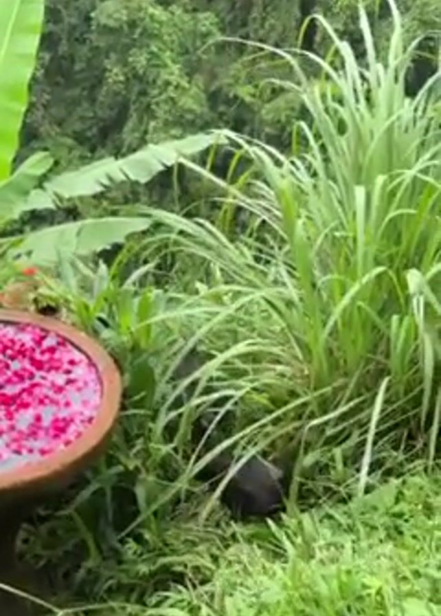 lush, tropical environment, possibly in Bali, Indonesia. The opening shot is a serene outdoor setting featuring a round, shallow basin filled with water and pink flower petals. Lush green plants surround the basin, and black chickens are partially obscured in the foliage. The camera then pans up to reveal a tall, multi-tiered waterfall cascading down a steep cliff covered in dense vegetation. The waterfall is surrounded by a jungle-like environment, with tall trees and green foliage framing the scene. The video provides a sense of tranquility and natural beauty.