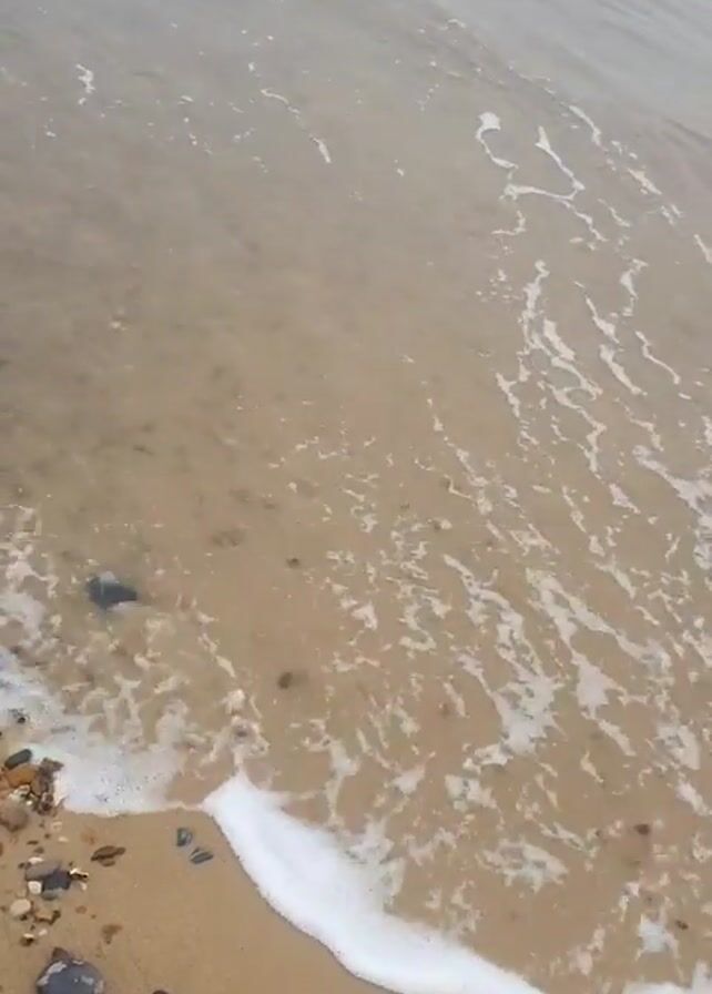 wave washing up on a sandy beach with small rocks. The water is murky and grey. The sky is overcast and the overall tone is muted. There are no people visible in the frame. The wave recedes, leaving wet sand and scattered pebbles behind.