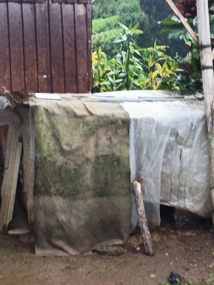 A makeshift structure is covered with draped, stained tarps. The left side of the tarp is heavily discolored with a dark green hue, while the right side appears grey. A wooden post leans against the structure's right side. The structure abuts a dark wooden wall on its left. Beyond the wall and structure, lush green foliage and trees are visible. The ground is dirt.