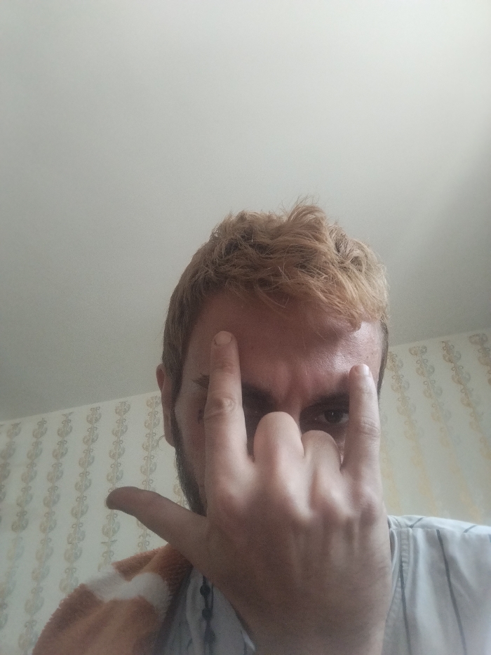 This image is an indoor close-up portrait of a male individual, taken in Parand, Iran. The subject's face is largely obscured by his own hands. His left hand (viewer's right) is positioned prominently in the foreground, forming a "rock on" gesture with the index and pinky fingers extended upwards, while the middle and ring fingers are curled and the thumb is tucked. His right hand (viewer's left) is placed behind the left, also forming a similar "rock on" gesture, with its extended index and pinky fingers touching his forehead. Visible facial features include light brown, short, and slightly disheveled hair, and dark eyes looking directly at the camera with a focused expression. Dark stubble is present on the sides of his face. He is wearing a light-colored shirt with subtle vertical stripes, and a dark beaded necklace is partially visible around his neck. A brown and white striped fabric, possibly a towel or blanket, is draped over his left shoulder. The background consists of a plain, light-colored ceiling or upper wall in the upper half of the frame. The lower half displays a wall covered in patterned wallpaper, featuring repeating vertical columns of light-colored, ornate scrollwork or floral motifs against a lighter, possibly beige, background. The scene is evenly lit by ambient indoor lighting.