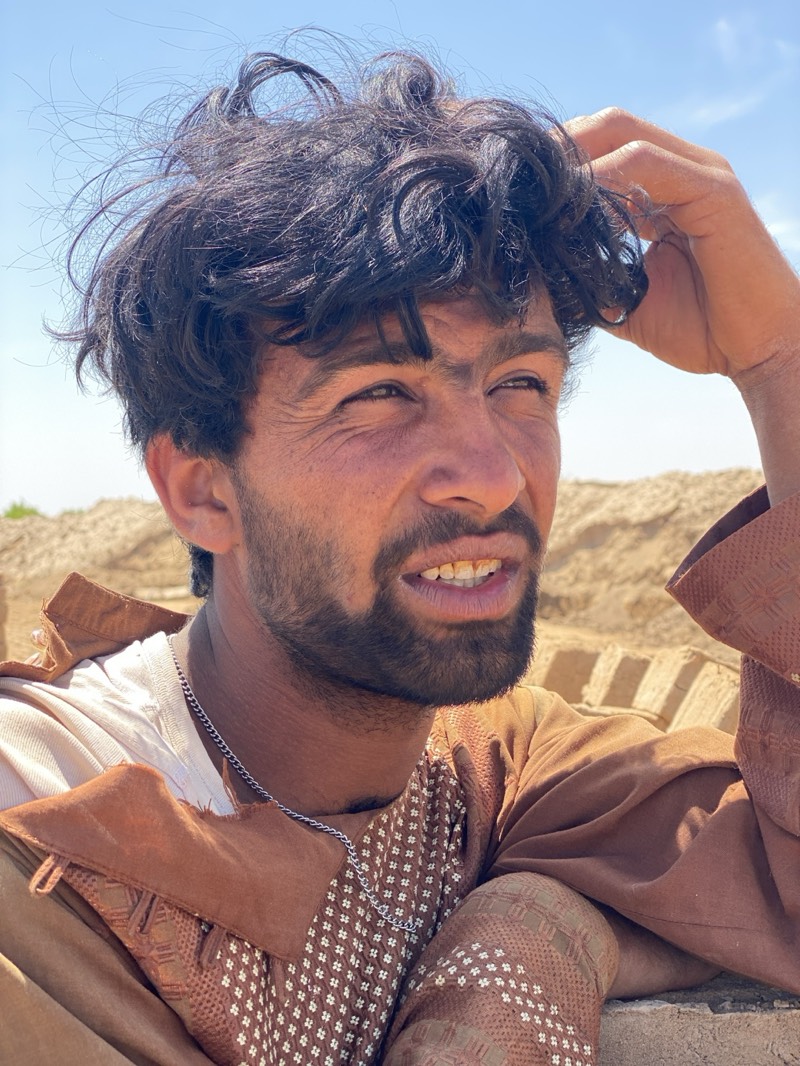 A medium shot shows a man in Deh-E Bagh, Afghanistan. He has dark curly hair and a beard. He wears a white t-shirt under a brown embroidered garment and a silver chain around his neck. His right hand is raised to his head. The background includes a blue sky and a tan structure, possibly made of bricks.