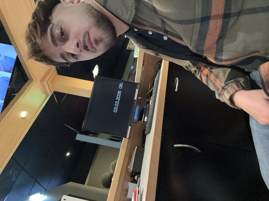 An indoor scene features a young adult male in the foreground, looking directly at the camera. He wears a dark blue collared shirt under an open olive-green, dark blue, and orange plaid jacket. He is positioned in front of a light-colored wooden counter. On the counter, to the left of the male, a black computer monitor displays "03.03.2026 08:" in white text on a dark screen. A black keyboard is situated below the monitor. Further left on the counter, a black perforated basket holds papers, with additional red papers visible next to it, and two dark, spherical decorative objects are present. The counter's base consists of dark cabinets with curved silver handles. Overhead, the environment includes light beige structural elements and a black ceiling with recessed spotlights. A blurred reflective surface, possibly a screen or window, shows indistinct blue and white colors in the upper right. The specific location within the city of Remscheid, Germany, is not visually identifiable from the image.
