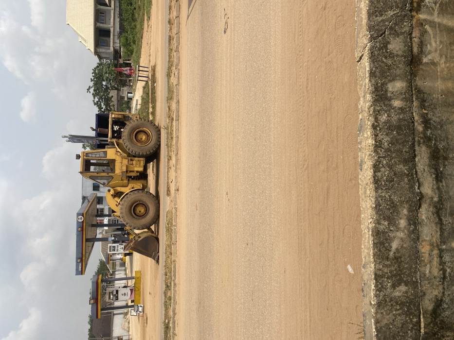 The scene depicts a roadside area in Igbessa, Nigeria, under a hazy or lightly overcast sky. A yellow wheel loader is prominently positioned on an unpaved shoulder, facing left with its front bucket lowered to the ground. To its immediate left, a gas station is visible, featuring a grey canopy with red and yellow accents, two fuel pump islands with white and red pumps, and a sign displaying "IDGESA". To the right of the loader, an unpaved area contains two small tables and a red umbrella. In the background, a multi-story building with a light-colored, pitched roof stands amidst other distant structures and sparse vegetation. The foreground consists of a grey concrete curb bordering a light brown, dusty paved road showing tire tracks and minor debris. No people are visible.