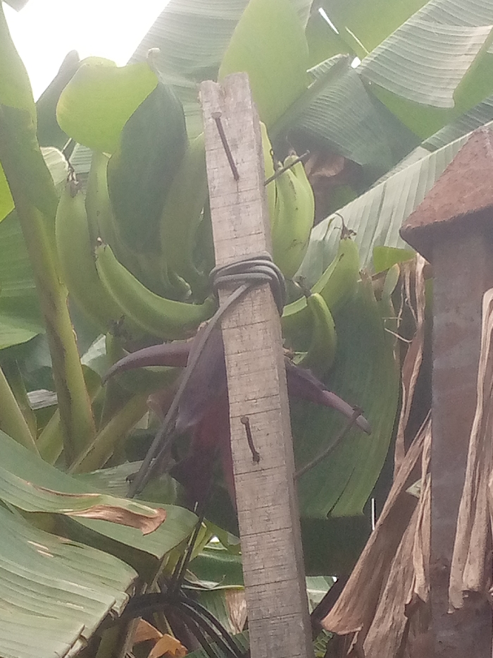 The image displays a close-up view of a banana or plantain plant laden with a large cluster of green, unripe fruit, situated in Iranla, Nigeria. A light-colored, vertically oriented wooden post or plank, approximately 10-12 cm in width, is positioned in the mid-foreground, partially obscuring the fruit. Two metal nails, each roughly 7-8 cm in length, are hammered into the wooden post, one near the top of its visible section and another below it, both angled slightly downwards. A dark-colored wire or rope is wrapped horizontally around the post, positioned between the two nails. Below the main cluster of fruit and to the left of the wooden post, a dark purple banana blossom (male bud) is visible. The background is dominated by numerous large, green banana leaves. On the far right edge of the frame, a small section of a reddish-brown structure, consistent with a tiled or corrugated roof, is present alongside some dried brown foliage. No individuals are depicted, and no specific actions or interactions are observable within the scene.