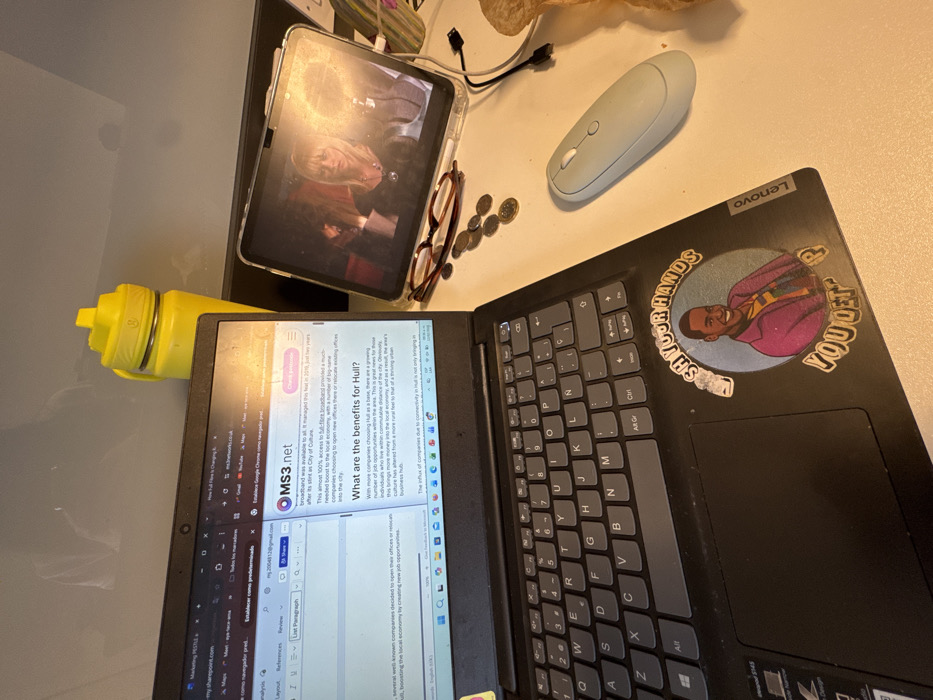 cluttered desk with various objects. A laptop displays a document about the benefits of Hull, UK, with text from MS3.net. The laptop has a sticker featuring a cartoon of Drake with the phrase "SHYOUR HANDS YOU GET D UP". A tablet shows a video of two women. A wireless mouse, eyeglasses, coins, and a yellow water bottle are also present. The laptop keyboard and touchpad are visible.