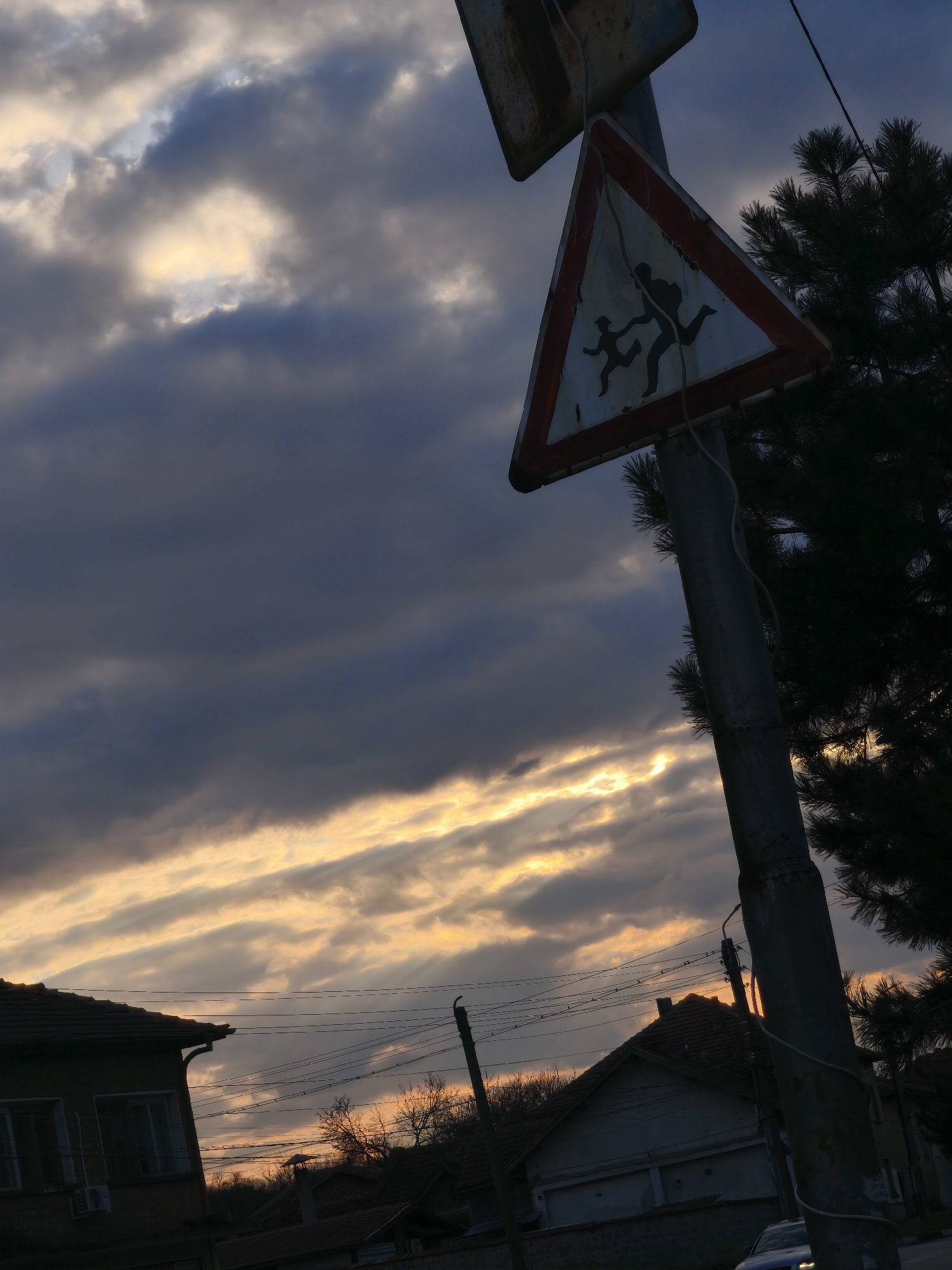 The image depicts a street scene in Slavyanovo, Bulgaria, at dusk or dawn, characterized by a heavily clouded sky with rays of golden sunlight breaking through dark, slate-grey clouds. The primary subject is a weathered, triangular warning sign for "Children Crossing" or "Pedestrians" mounted on a grey utility pole, positioned in the upper right quadrant. The sign features a red border and two dark silhouettes of running figures, one adult and one child, on a faded white background. Portions of the sign's surface show deterioration and rust. Several thin, light-colored wires are visible wrapped around the pole. To the right of the pole, a dark green coniferous tree with dense needles is partially visible, silhouetted against the sky. In the background, particularly in the lower left and center, are several dark silhouettes of residential buildings with tiled roofs, indicative of traditional Bulgarian architecture. Power lines traverse the sky horizontally between poles, connecting various structures. The lower edge of the image reveals the top portion of a vehicle, appearing dark blue or grey, parked on what seems to be a street or driveway. The overall lighting is dim, with strong contrasts between the illuminated sky and the dark foreground elements.