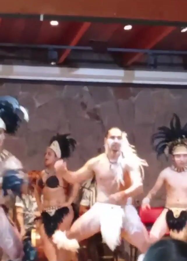 group of performers, likely Polynesian dancers, on a stage. The performers are wearing traditional attire, including skirts, headdresses, and body paint. They are performing a synchronized dance routine. In the foreground, there are audience members watching the performance, including a woman and a child. The stage is set in what appears to be a restaurant or event space with a wooden ceiling. The lighting is bright, and the atmosphere is lively.