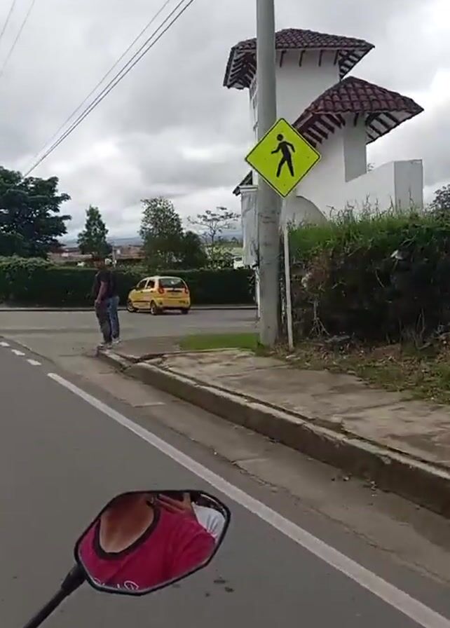 The video, shot from the perspective of a motorcyclist, shows a ride past the entrance to "Jardines de Paz". The motorcyclist is riding on a road with a grey Nissan March parked on the side. There is a pedestrian crossing sign. As the motorcyclist continues, the camera focuses on the white entrance gate of Jardines de Paz, featuring a cross symbol. A yellow taxi is parked nearby. The video continues with a view of a manicured hedge. The sky is overcast, suggesting a cloudy day. The video appears to be taken in a residential area with trees and other foliage.