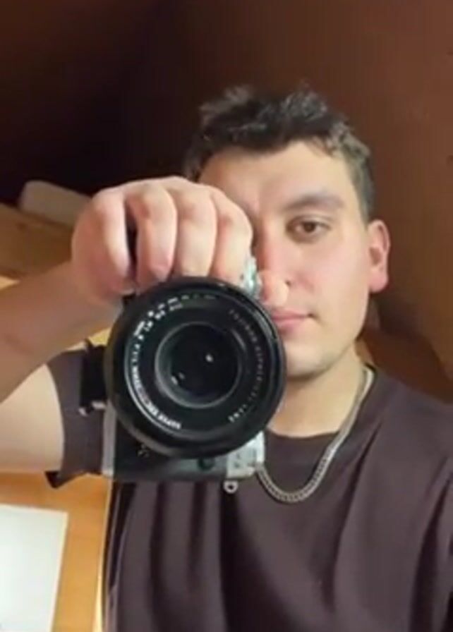 A young man is holding up a silver camera towards the viewer, taking a photo of them