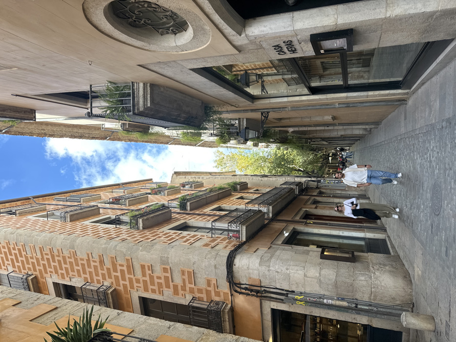 The image depicts Carrer dels Ciutadans in Girona, Spain, a narrow cobblestone pedestrian street flanked by multi-story buildings under a partly cloudy blue sky. On the left, a multi-story building features a light gray stone base and an upper facade with light orange brick-like patterns on a gray background. It is equipped with several black wrought-iron balconies, many containing green planters. Electrical conduits are visible on the building's corner. The ground floor includes a storefront with reflective windows. On the right, a building with a smooth, light beige facade also has black wrought-iron balconies adorned with cascading green plants. A circular decorative window with a metal grate is situated above the ground floor. A sign reading "CASA HERAS" is prominently displayed on the ground floor, above a large reflective window and an attached black menu board. Two black, wall-mounted streetlights are affixed to this facade. In the mid-ground, two individuals walk towards the camera. The person on the left is female, wearing a white long-sleeved top, olive green wide-leg trousers, and white sneakers, carrying a dark jacket and a white shoulder bag. The person on the right is male, wearing a white t-shirt, light blue jeans, and white sneakers. Several other blurred pedestrians are visible further down the street, which extends towards a visible cluster of green trees. A stone bollard is positioned in the lower left foreground.