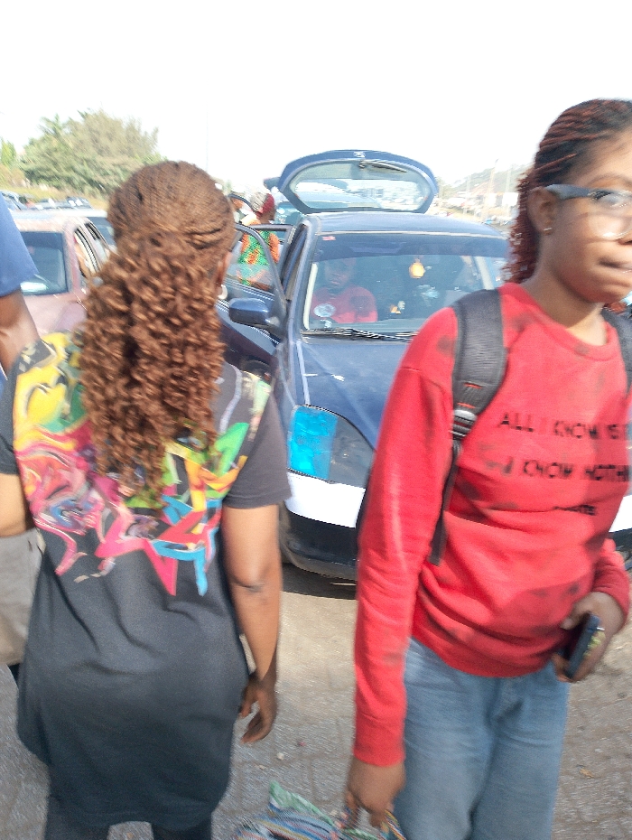 Two women stand near a dark blue car with its trunk open. The woman on the left wears a black t-shirt with a colorful design on the back and has braided hair. The woman on the right wears a red long-sleeved shirt and blue jeans, also sporting braided hair and glasses, carrying a phone and multicolored material. A person sits inside the car, and other cars are visible in the background. The setting appears to be an outdoor parking area.